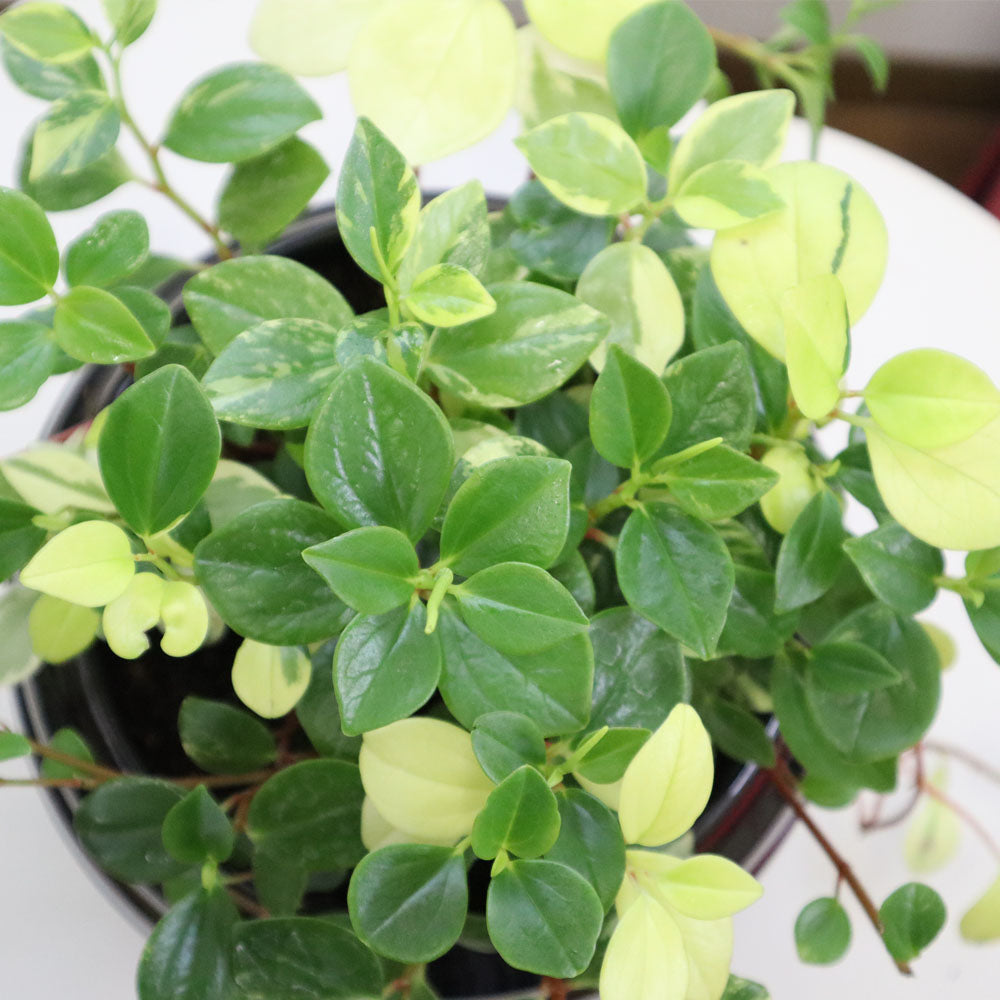 黄色と緑の斑入り模様が鮮やかなペペロミア グラベラ。