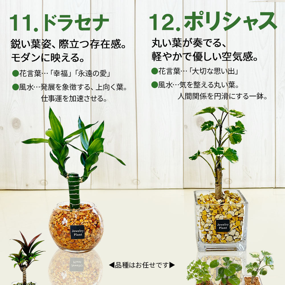 | 花言葉 | 【花言葉・風水効果】 ■パキラ…『快活』『勝利』 「発財樹」と呼ばれ、金運・仕事運を強力に後押し。 【場所】職場・リビング・玄関 ■ガジュマル…『健康』 精霊が宿る「多幸の木」。金運を引き寄せ幸せを呼ぶ。 【場所】寝室・玄関(リラックス) ■サンスベリア…『永久』『不滅』 鋭い葉が邪気を払い、空間を強力に浄化する。 【場所】玄関・水回り・オフィス ■テーブルヤシ…『貴女を見守る』 集中力を高め、仕事運・金運アップに役立つ。 【場所】玄関・書斎(成功運) ■ネオレゲリア…『情熱』『個性』 鮮やかな色が活力を与え、人間関係を活性化。 【場所】デスク・リビング ■ポトス…『永遠の富』 金運・恋愛運など幅広い運気を改善する万能植物。 【場所】書斎・オフィスデスク ■アイビー…『友情』『不滅』 邪気を払い、家族の成長や事業の発展をサポート。 【場所】リビング(気の調和) ■シンゴニウム…『喜び』『平和』 優しい葉色が対人関係を穏やかに整える。 【場所】東(成長)・南(直感) ■ペペロミア…『可愛らしさ』 丸い葉が「調和」を象徴し、気を安定させる。 【場所】デスク・書斎・リビング ■シェフレラ…『実直』 上向く葉が運気を上げ、邪気を払う。仕事運に◎。 【場所】玄関・オフィス・キッチン ■ドラセナ…『幸福』 「幸福の木」。家全体に活力を与え、開運を導く。 【場所】玄関・リビング(気の改善) ■ポリシャス…『大切な人』 個性的な葉が邪気を払い、対人トラブルを防ぐ。 【場所】玄関・オフィス(魔除け) ■ビオラセア ジュダ 錦…『変わらぬ愛』『優しい愛情』 赤紫の葉はエネルギーの象徴。空間に力強さをもたらし、創造性や行動力を高めるとされる。 【場所】リビング・ワークスペース(活性化) |